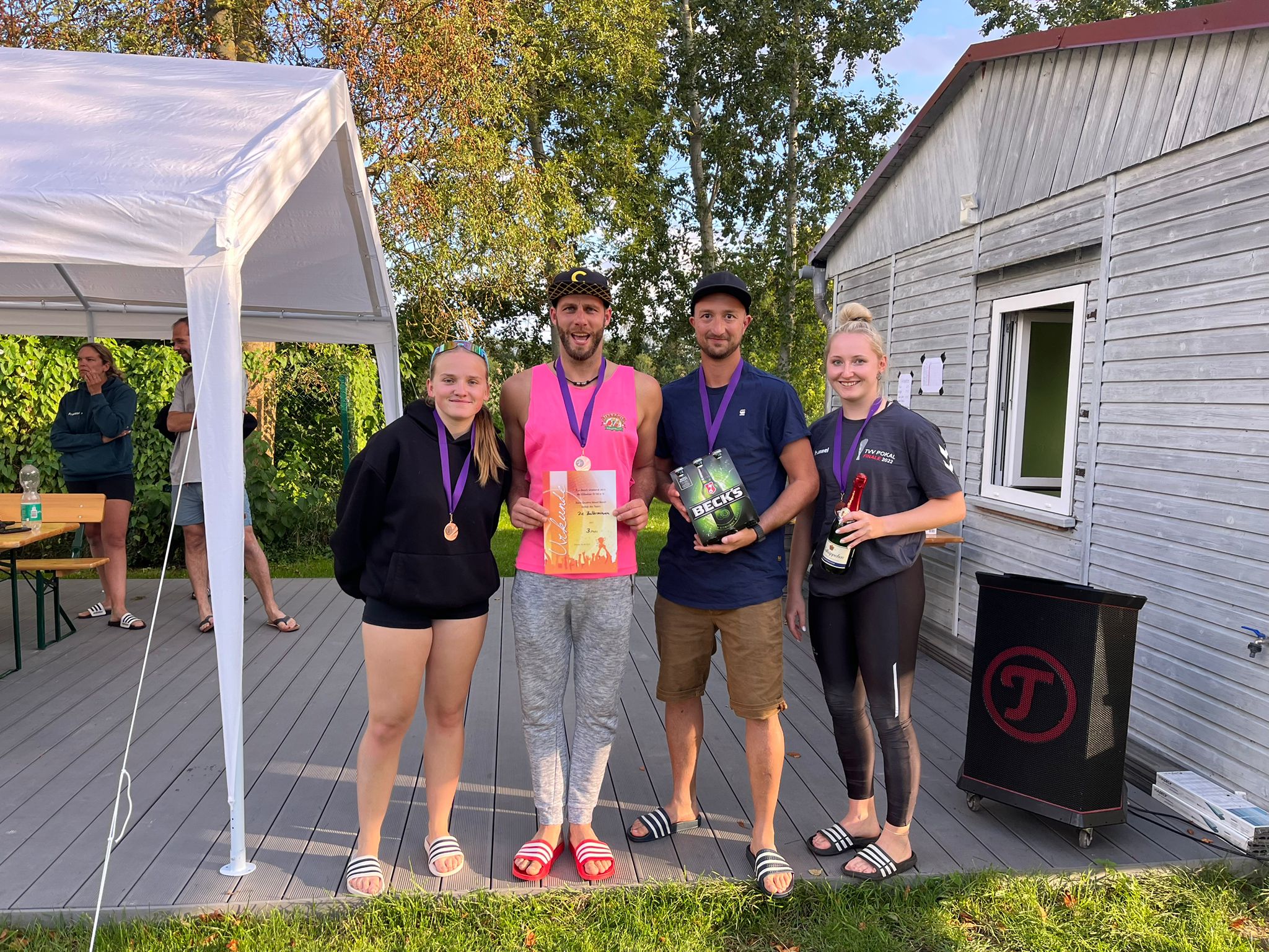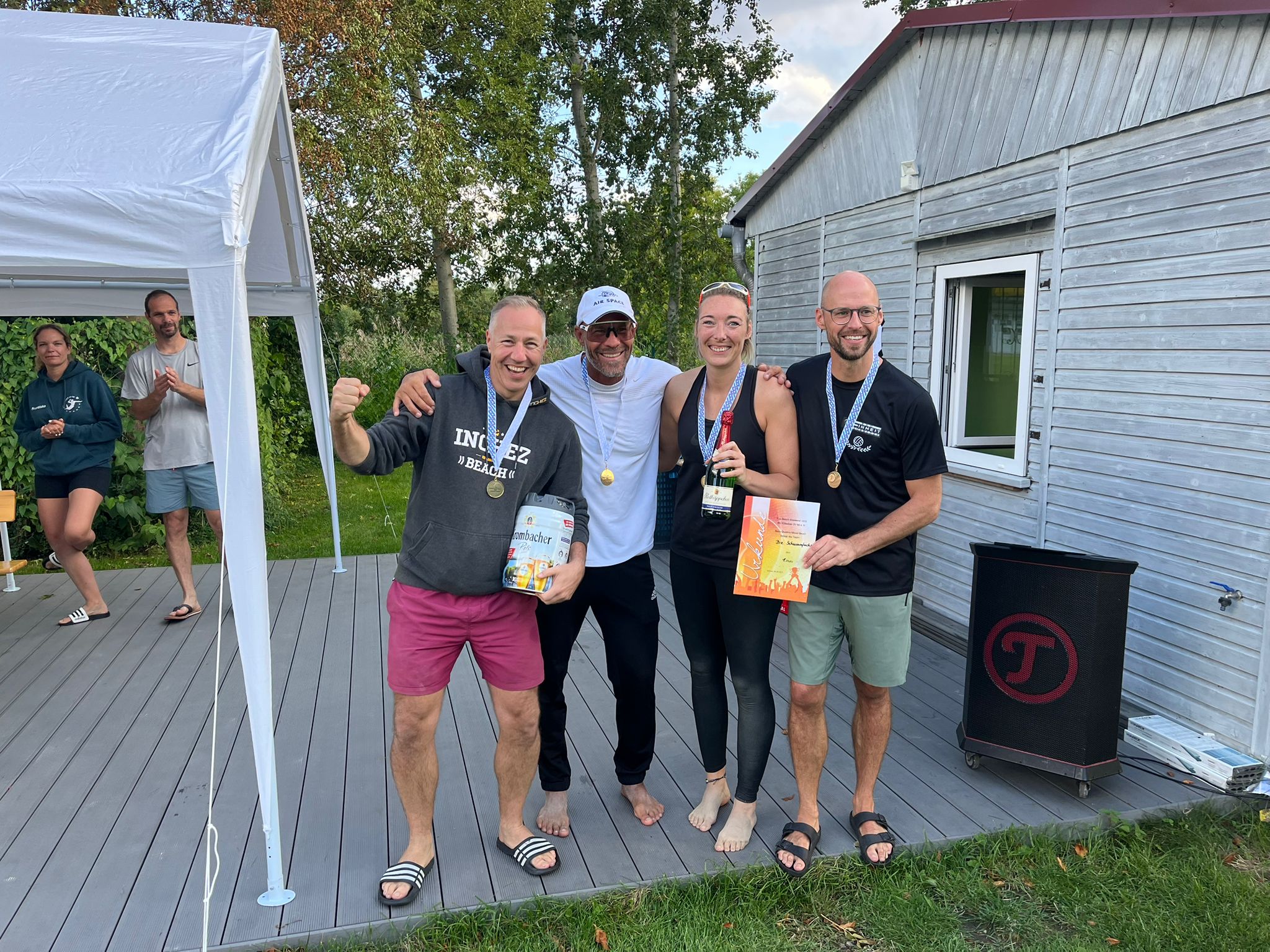 Am Samstag starteten 13 Teams beim Quattro Mixed Beach. Schon in der Vorrunde ging es heiß her, und spätestens in den Finalspielen hielt es niemanden mehr auf den Plätzen. Im kleinen Finale sicherten sich die Ballermöwen nach einem spannenden Schlagabtausch den dritten Platz gegen Meine Familie und Dean. Im großen Finale kam es dann zum echten Highlight: Die Lokalmatadoren Schellluschen lieferten sich ein packendes Duell mit den Schwimmfüchsen – am Ende hatten die Füchse knapp die Nase vorn und jubelten über den Turniersieg.
